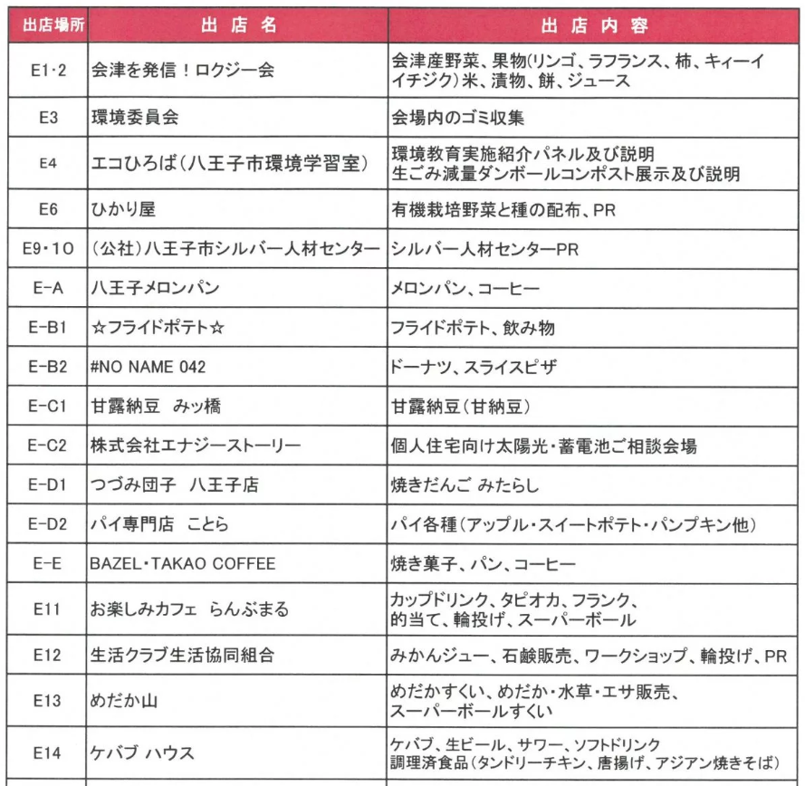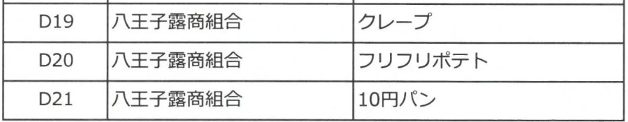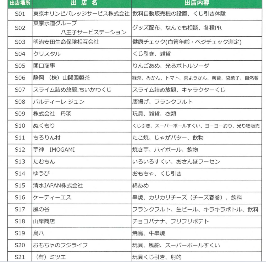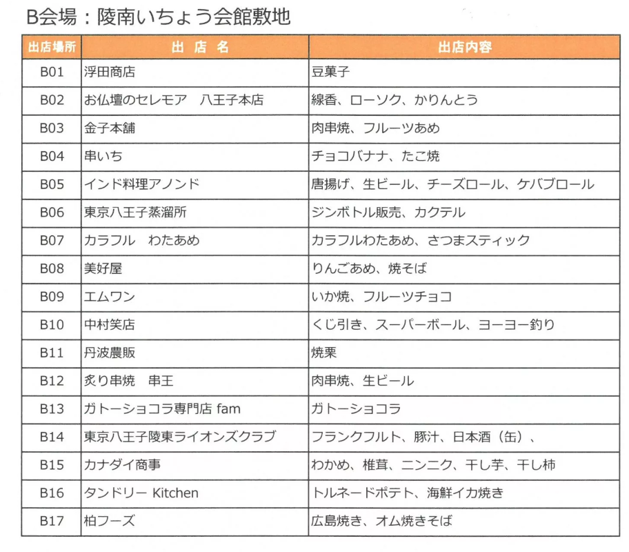 八王子いちょう祭りの屋台・露店・キッチンカーは、「陵南会館」「陵南公園本園」「陵南公園分園」「南浅川橋西河川沿い」「長房市民センター前 河川敷」の6会場に出店されます。