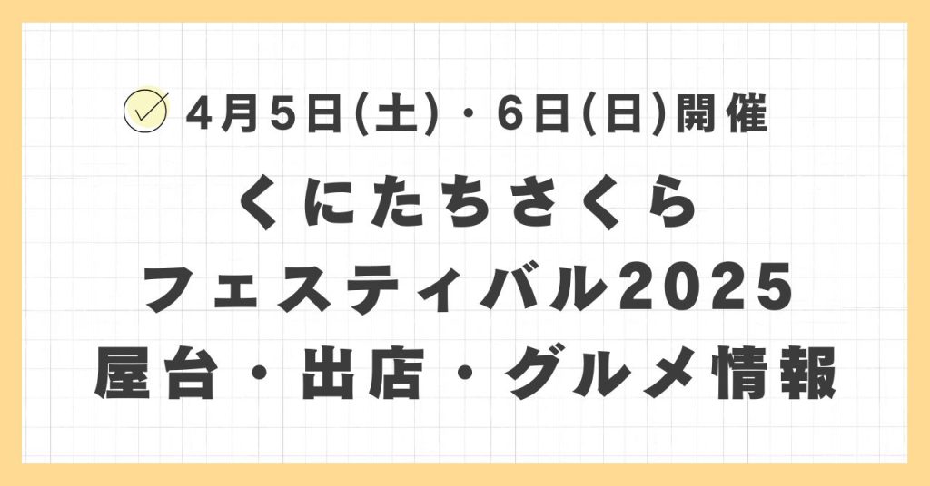 2025年4月5日(土)・6日(日)に東京都国立市の「大学通り」周辺で開催される「第48回くにたちさくらフェスティバル」では、満開の桜を楽しみながら、多彩な屋台グルメを堪能できます。 本記事では、屋台の出店場所や営業時間、おすすめグルメ、混雑情報につ...