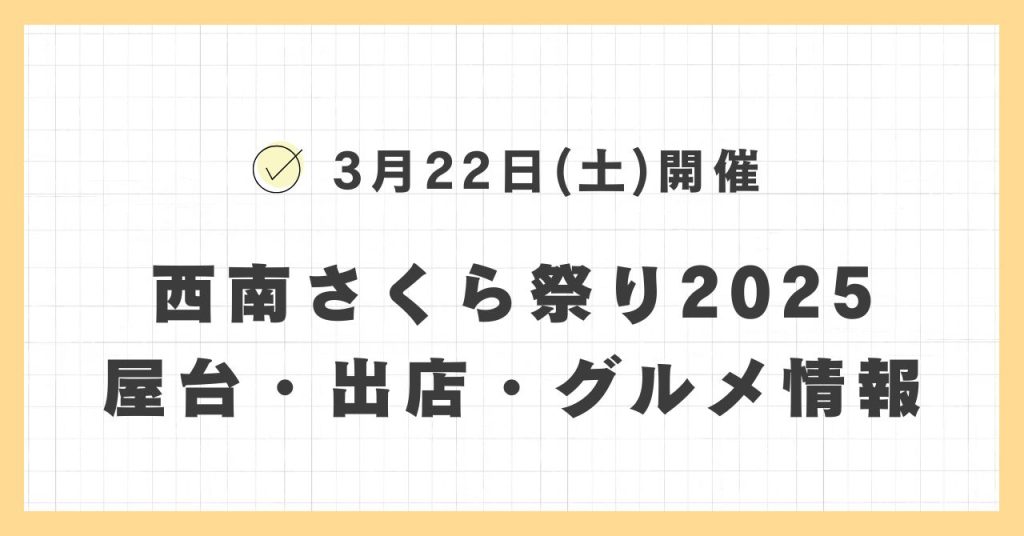 2025年3月22日(土)、埼玉県さいたま市南区の「花と緑の散歩道」で開催される「第34回西南さくら祭り」では、満開の桜を楽しみながら、多彩な屋台グルメを堪能できます。 本記事では、屋台の出店場所や営業時間、おすすめグルメ、混雑情報について詳しく... -
