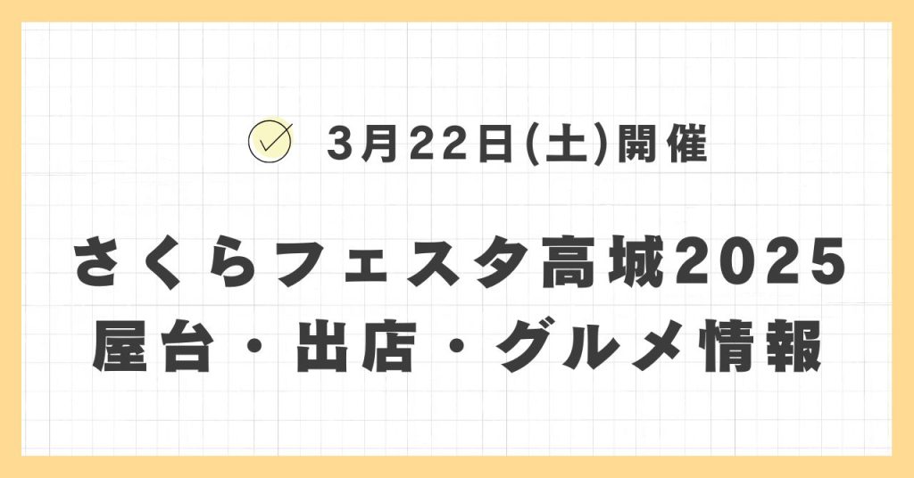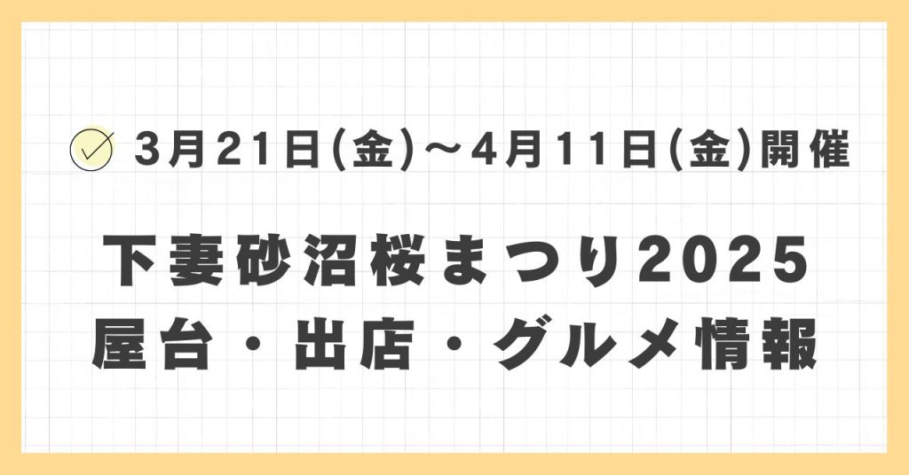 2025年3月21日(金)~4月11日(金)に開催される「下妻砂沼桜まつり」では、満開の桜とともに、多彩な屋台グルメを楽しむことができます。 本記事では、屋台の出店場所や営業時間、おすすめグルメ、混雑情報について詳しくご紹介します。 【下妻砂沼桜まつり... -