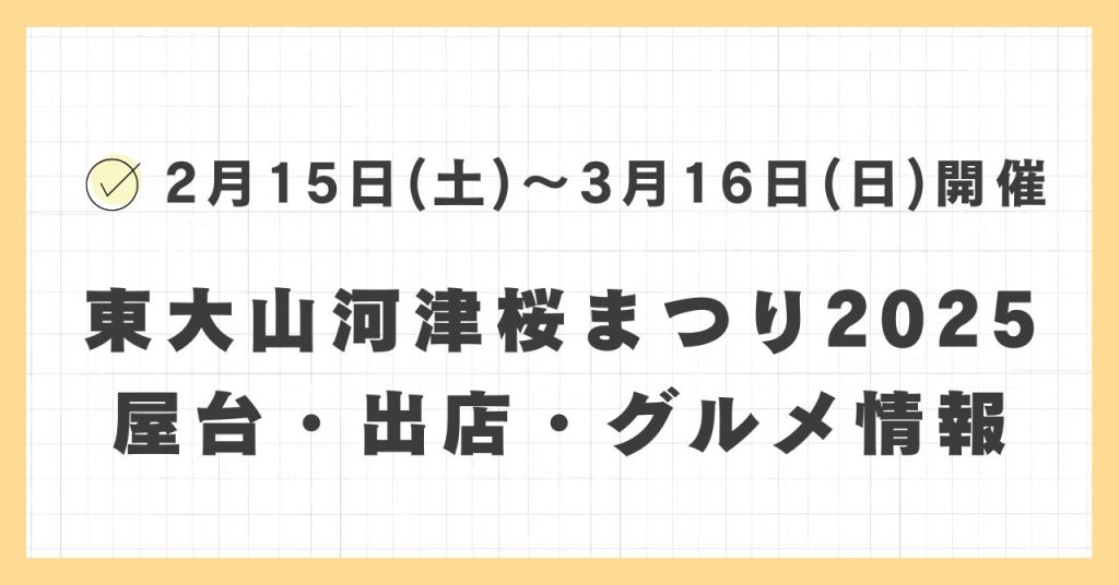 2025年2月15日(土)~3月16日(日)で開催される「東大山河津桜まつり」では、美しい河津桜を楽しみながら、多彩な屋台グルメを堪能できます。 本記事では、屋台の出店場所や営業時間、おすすめグルメ、混雑情報について詳しくご紹介します。 【東大山河津桜... -