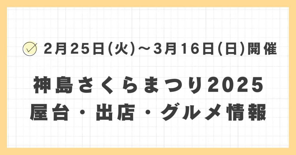 2025年2月25日(火)~3月16日(日)、静岡県の川の駅伊豆城山周辺で開催される「神島さくら祭り」では、満開の桜を楽しみながら、多彩な屋台グルメを堪能できます。 本記事では、屋台の出店場所や営業時間、おすすめグルメ、混雑情報について詳しくご紹介しま... -