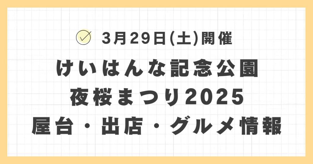 2025年3月29日(土)、京都府相楽郡精華町の「けいはんな記念公園」で開催される「夜桜まつり2025」では、美しい夜桜を楽しみながら多彩な屋台グルメを味わうことができます。 本記事では、屋台の出店場所や営業時間、おすすめグルメ、混雑情報について詳... -