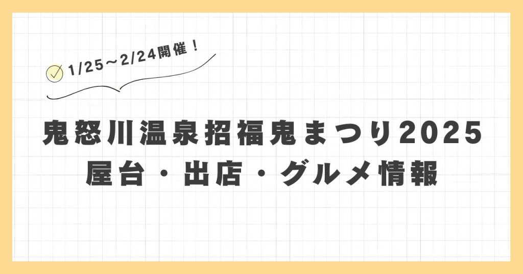 2025年1月25日(土)~2月24日(月)に、鬼怒川温泉で「鬼怒川温泉招福鬼まつり」が開催されます。 鬼怒川温泉招福鬼まつりは、1年の邪気を払い、福を招くお祭り。 そんな鬼怒川温泉招福鬼まつりですが、屋台・露店の出店も楽しみのひとつです。 約10店舗の屋... -