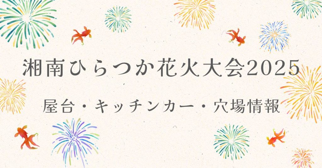 湘南の夏の締めくくりを飾る「湘南ひらつか花火大会」が、2025年も開催予定! 相模川の河川敷から打ち上がる約3,000発の花火と、湘南グルメを楽しめる屋台が魅力のローカル花火大会です。 この記事では、湘南ひらつか花火大会2025の屋台情報・穴場スポット...