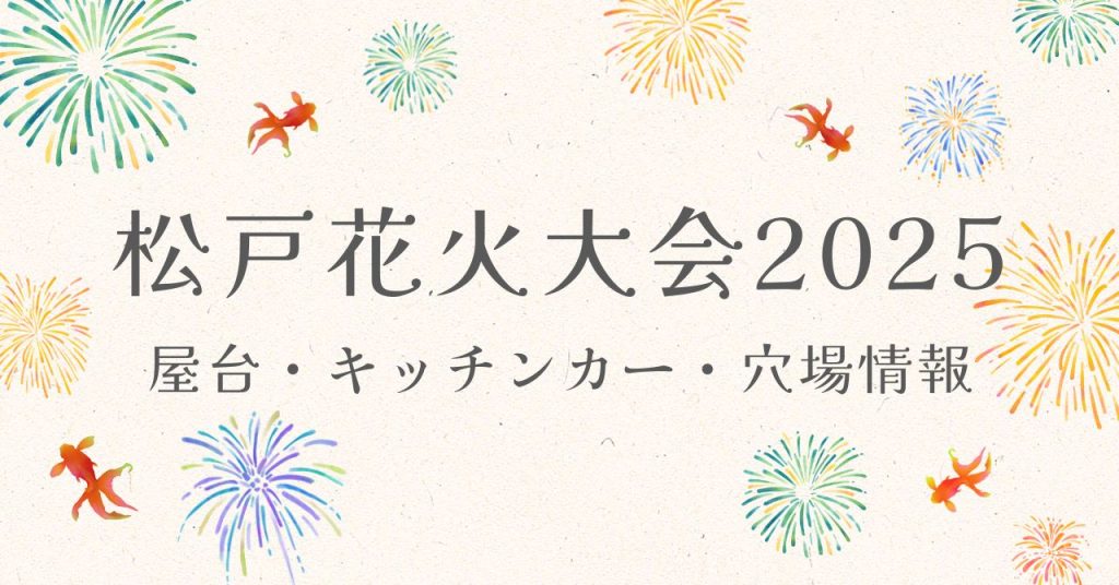 松戸市の夏を彩る一大イベント「松戸花火大会」が、2025年も江戸川河川敷で開催されます! 都心からのアクセスがよく、河川敷から見上げる花火は大迫力。市街地とは思えないほど開放感のあるロケーションも魅力の一つです。 この記事では、屋台の出店場所... -
